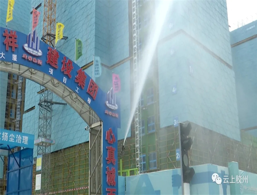 工地扬尘污染是工地标准化治理的一大难点。走进达能大厦工地,各种降尘设备齐发力,外部、内部线性喷淋系统24小时开启,大型雾炮机保证进出车辆喷水降尘。几名保洁人员作为环境专管员每天对硬化路面进行冲洗,建筑工地没有了人们印象中尘土飞扬的现象。